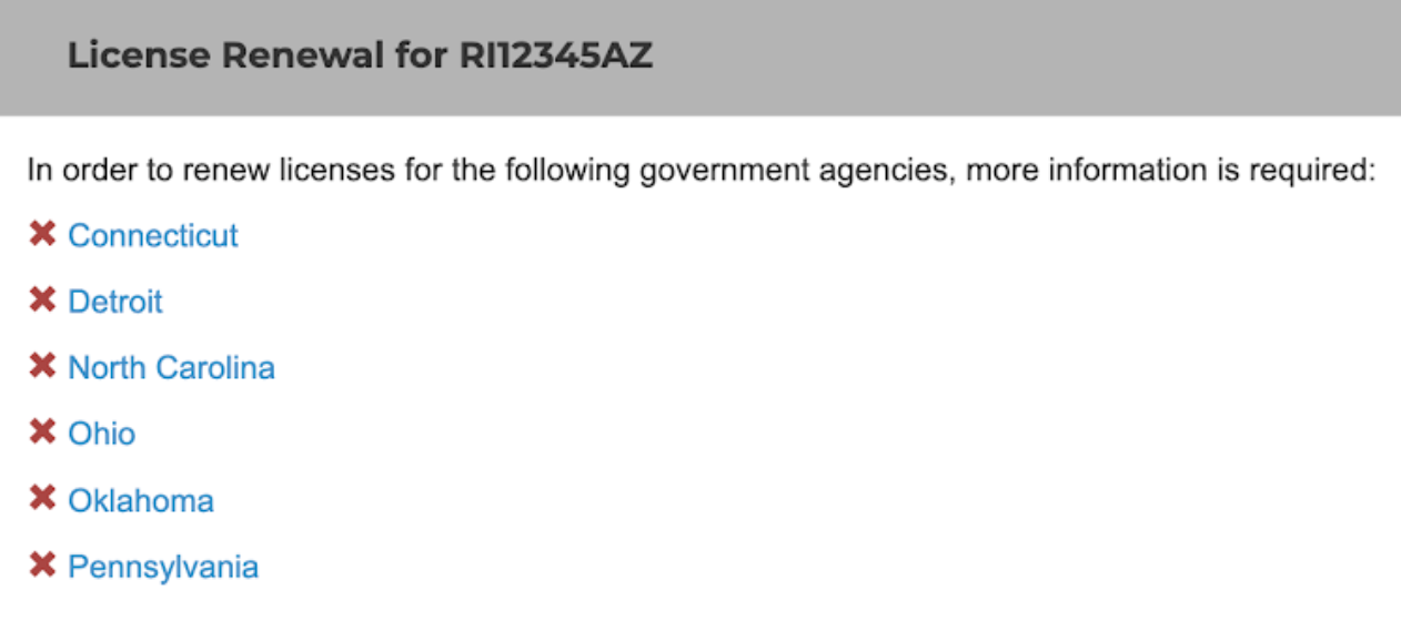 Once you have selected a URN, you will see a list of agencies that require information to complete the renewal process. Select an agency to see what information is required, and easily submit it through your GRS portal.
