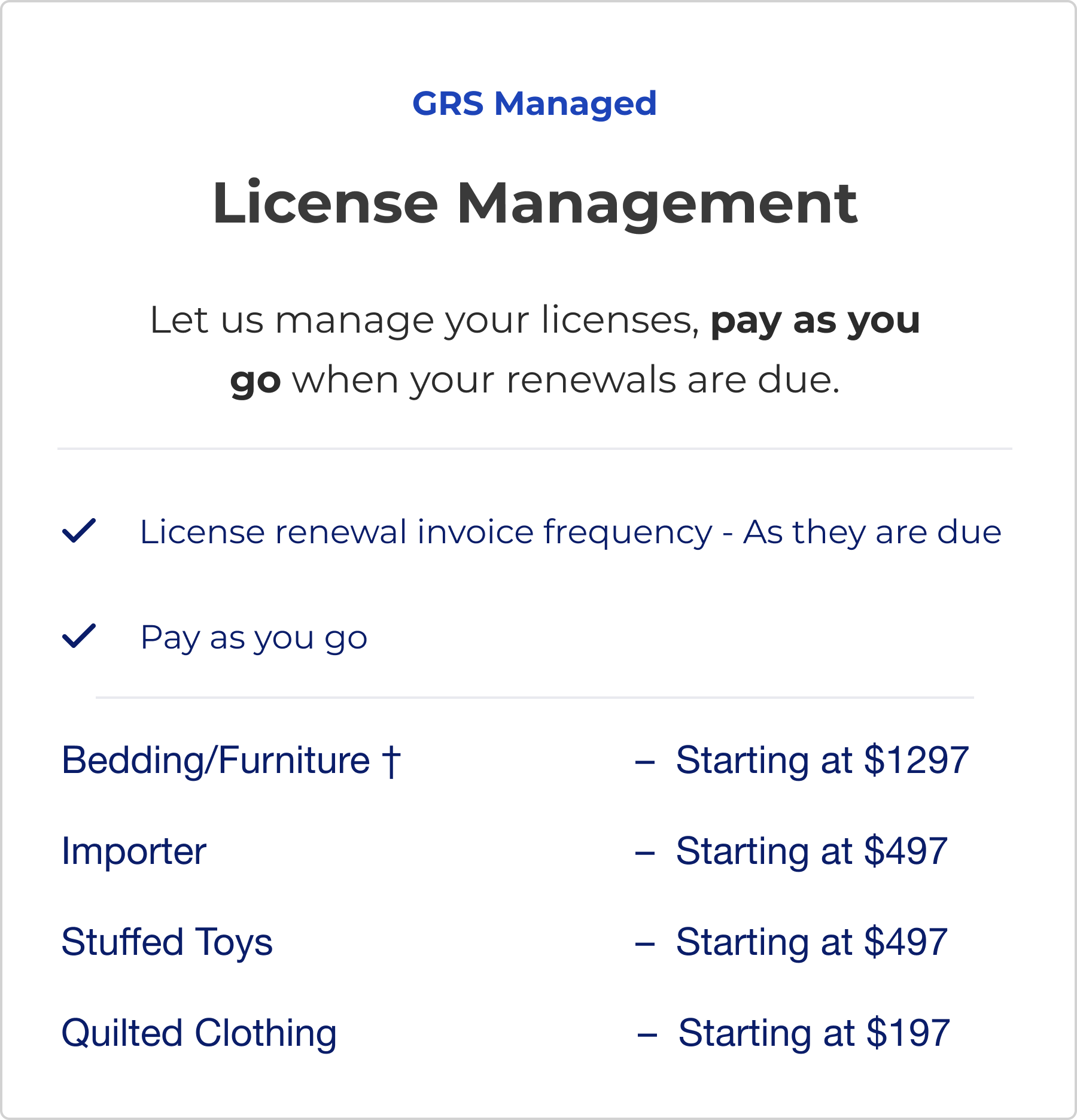 With Monitored Services, you can efficiently store and manage your URN or Quilted Clothing license data on our website. GRS can act on your behalf to manage your yearly license renewals, and consolidate your many renewals into one yearly payment plus added guarantees, depending on your level of management.
